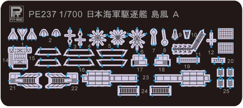This kit is molded in grey plastic and includes photo-etched parts, decals, and stand. Can be built as a full hull model or water line model.