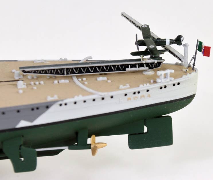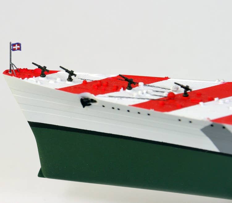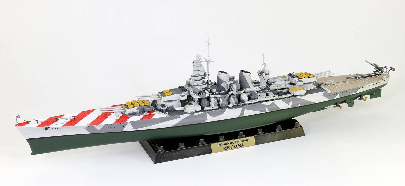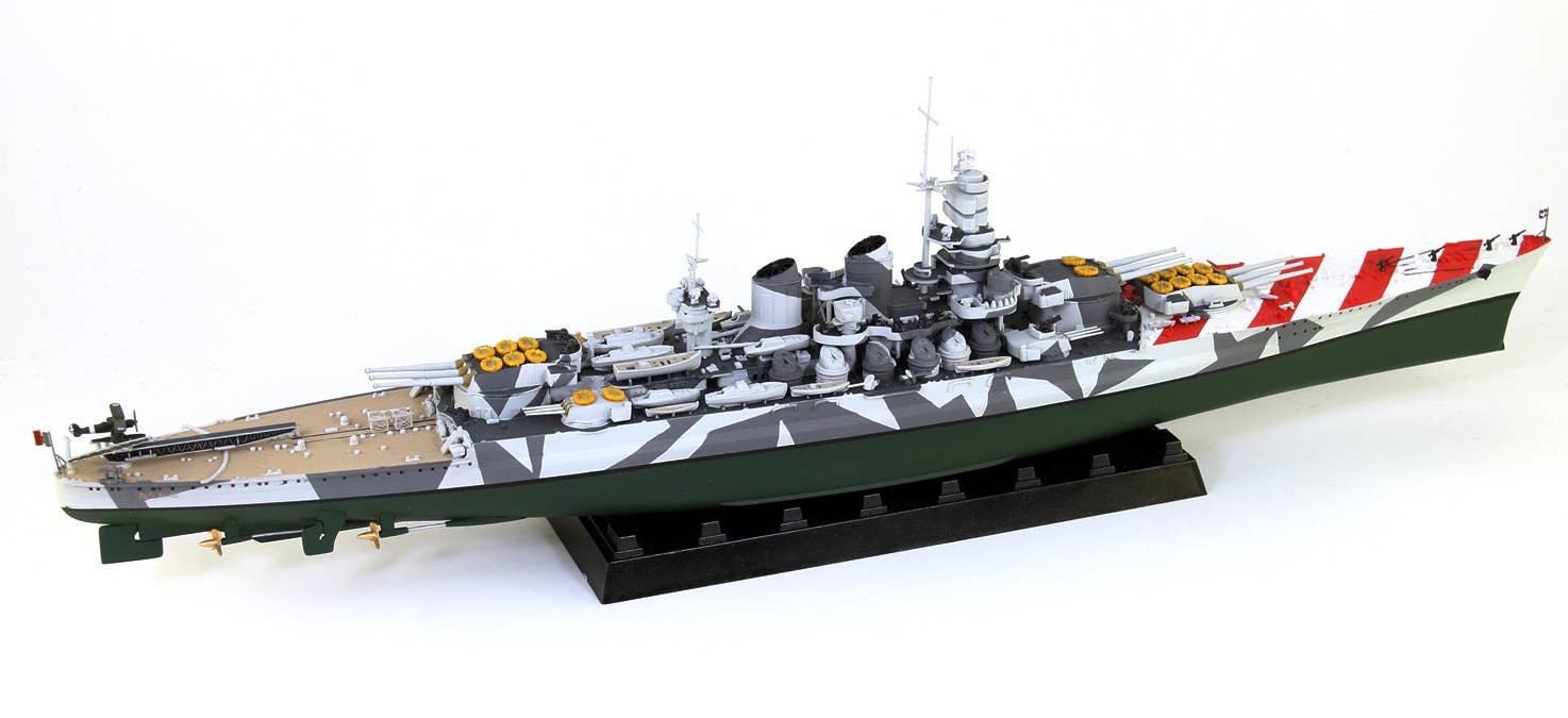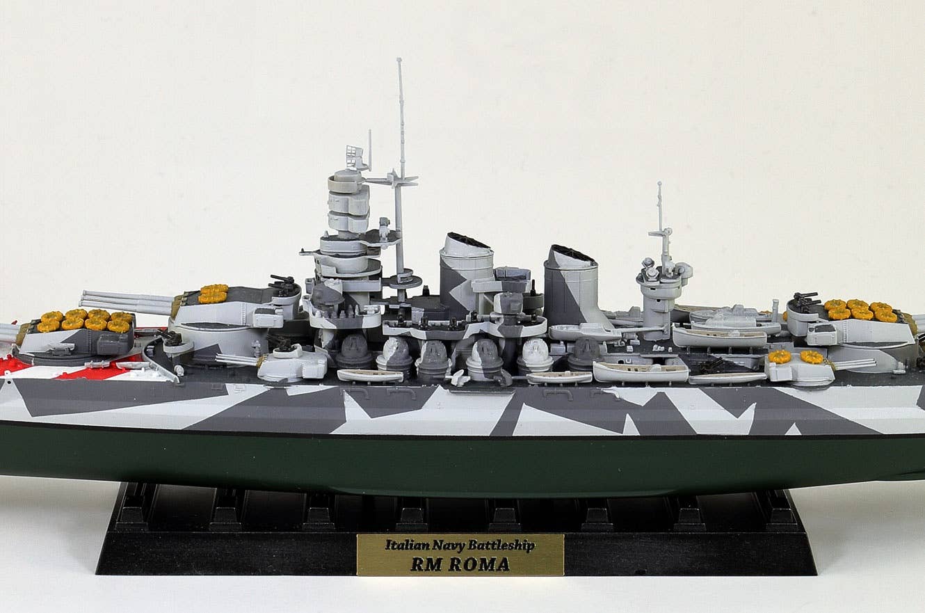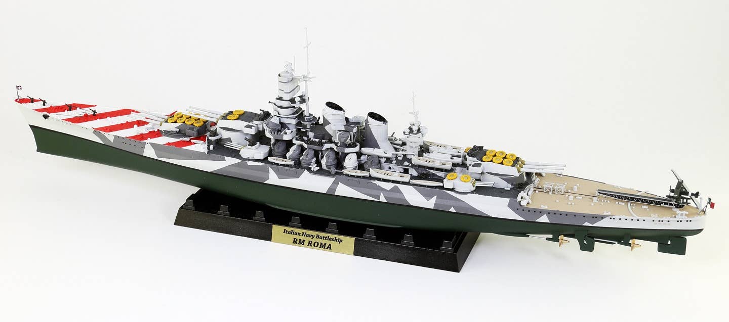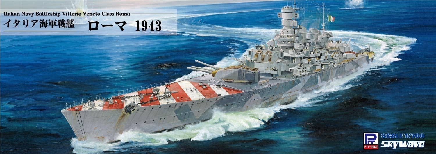 This is a highly detailed 1/700 scale plastic model kit of the 1943 Italian Navy Battleship Roma as shown in the photos. The kit includes parts to build one ship (total length: 340mm), etching parts (such as funnel cap/crane), a display stand, a flag, color photo-etched parts for the flagpole, and the ship's nameplate (10mm x 40mm). Order today!