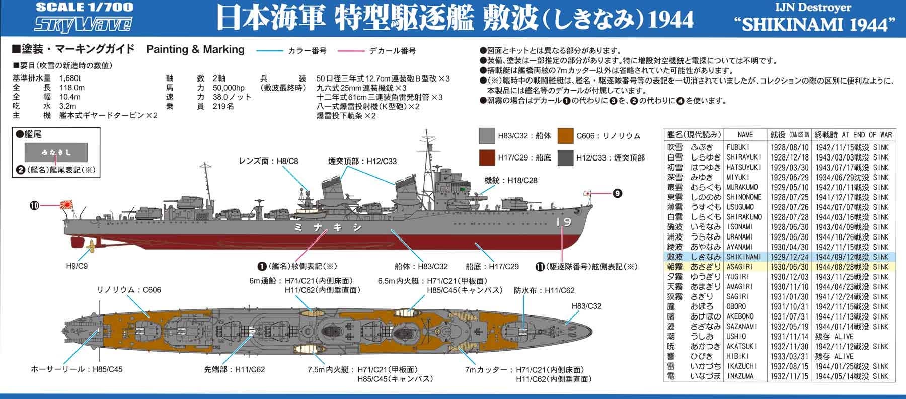 The Shikinami was put into service in 1932 as the twelfth special type destroyer. She belonged to the 19th Destroyer Corps along with the Isonami, Uranami and Ayanami, and at the beginning of the war took part in the Battle of Sunda Strait in 1942 and the Battle of Solomon in 1943. She was active in the Battle of the Bismarck Sea and the escort of the transport fleet, and sank in the South China Sea in September 1944 due to an attack of the U.S. submarine Growler.