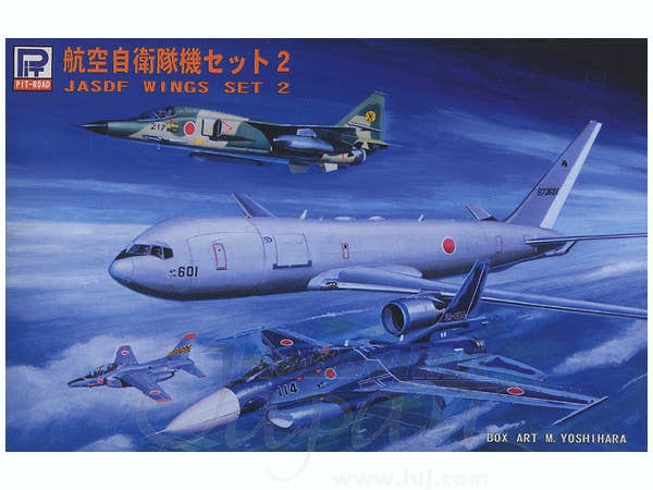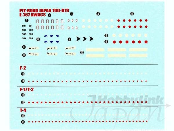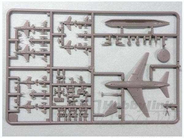 A set of 1/700 scale aircraft for use with ship models or dioramas. This set includes: 3 Boeing 767 aircraft, with parts to build them as either KC-767J tankers or E-767 AWACS aircraft; 6 each Mitsubishi F-1, Mitsubishi F-2 and Kawasaki T-4 aircraft; three full Patriot Missile batteries (each consisting of 4 trucks and two trailers); and three each Type 96 APC, 20mm Vulcan Air Defense System turret and radar truck for the VADS. Decals included.