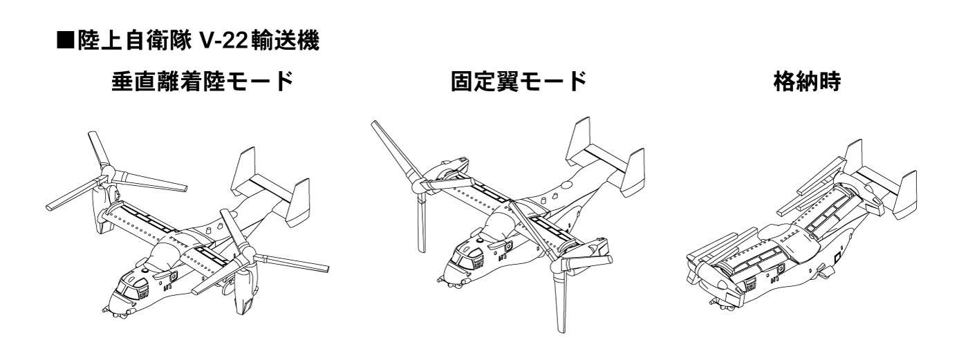 • V-22 Osprey (Vertical Takeoff and Landing Mode, Fixed Wing Mode, Stored Mode selectable) (Length: 25.2mm, Stored Length: 26.8mm) x 4