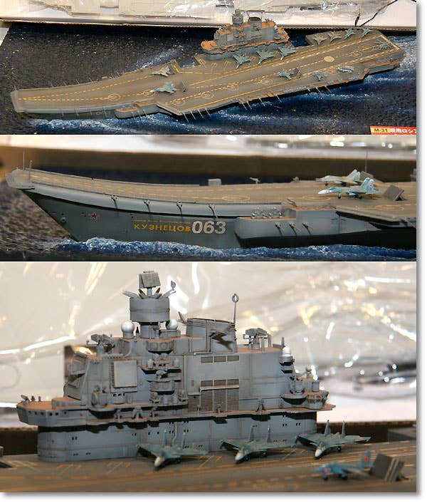 The Admiral Kuznetsov is the only aircraft carrier that the Russians have today. It has a ski-jump angled deck and can carry up to 60 aircraft. The Kuznetsov also has a formidal attack power for anti-ship and anti-sub operation capability. VLS launchers are lined up along the flight deck. Pit-Road has collaborated with Trumpeter Models to produce a beautifully-detailed injection plastic kit of this huge carrier. It can be built as either a water-line model or full-hull model. Many Mig-29, Su-33 and other helicopters are included. A good addition to your modern Russian Navy collection. If you wish to build the water-line version, a clear blue plastic "water" base (the one in the photos has been painted) is also included.