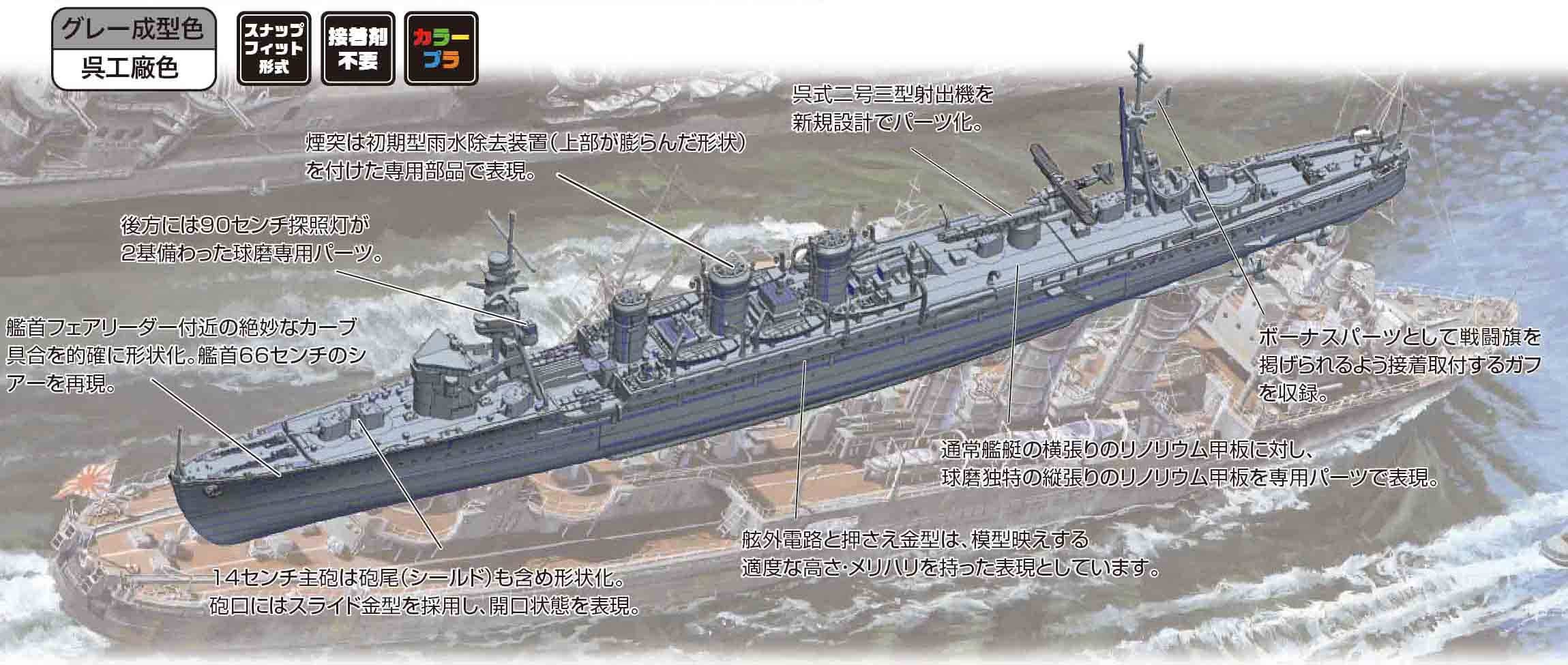 The 5,500-ton light cruiser Kuma, with its striking vertical deck, joins the Warship Next lineup from Fujimi! This kit depicts her before her anti-aircraft armaments were strengthened in 1945. Stickers are included for the details, and a special display base is included in the first run of this kit, featuring a wooden deck pattern and mechanic surface sculpture on the top for a truly deluxe display! (This display base will only be included in the first production run of this kit; if yours does not include this item, it was not part of the first production run.) Order yours today!