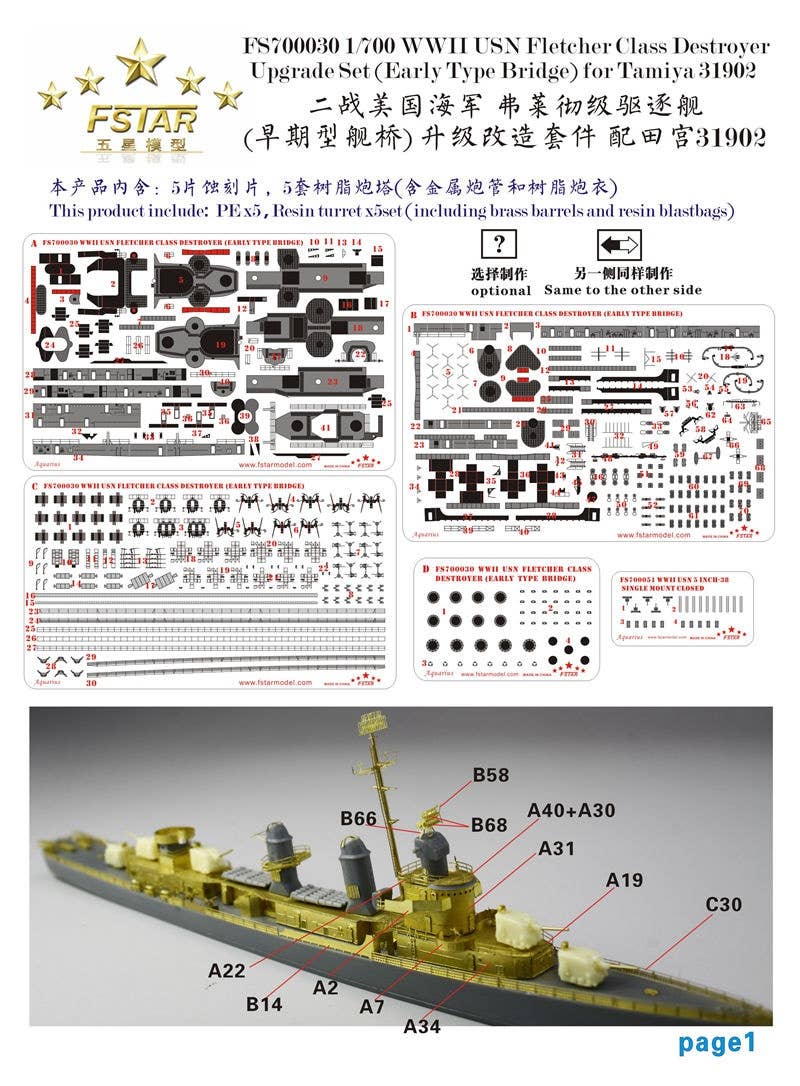 This is a set of upgrade detailing parts, including an early-type bridge, for the 1/700-scale U.S. Navy Fletcher-class destroyer from Tamiya. Order yours today!