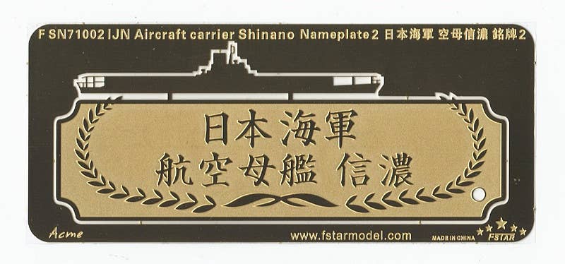 From Five Star Model comes this highly detailed 1/700 scale photo-etched part set for a WWII IJN Aircraft Carrier Shinano Nameplate 2. Good for modelers with a steady hand and a sharp eye. Order today!