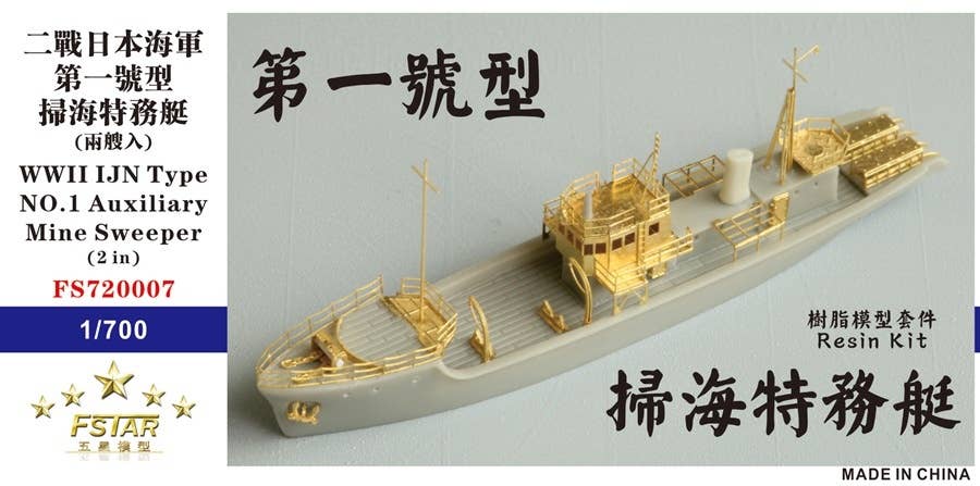 Nicely molded resin kit builds two pieces of the WWII IJN Type NO.1 Auxiliary Mine Sweeper. Includes photo-etched parts and brass barrels. Parts come molded in grey.