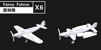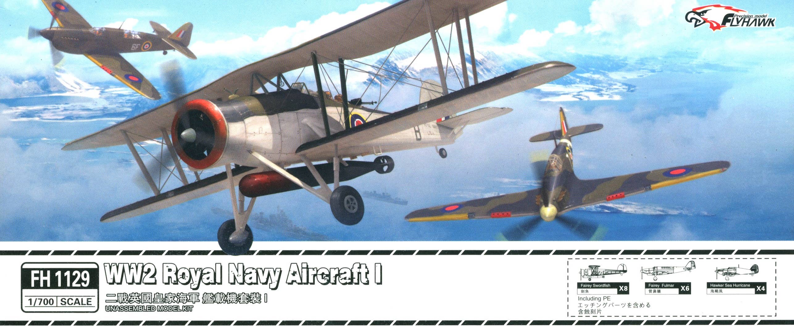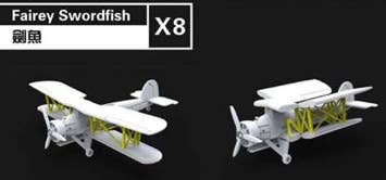 Molded in gray plastic, this kit includes photo-etch parts! Builds 8 Fairey Swordfish, 6 Fairey Fulmar and 4 Hawker Sea Hurricane aircraft in 1/700 scale.