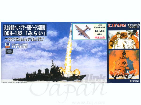 A special re-release of Pit-Road's fine 1/700-scale Aegis class kit with markings to replicate the Mirai from the manga "Zipang." Includes painting instructions, markings and the MVSA-32J tilt-rotor aircraft and SUH-60EJ helicopter used in the series. This special re-release also includes a highly detailed 8-piece cast white metal B-24 Liberator bomber.