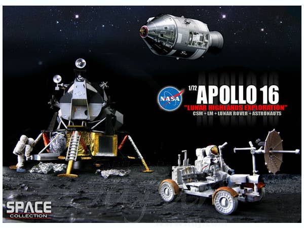 Fully finished models of the Apollo 16 CSM, LEM, and Lunar Rover! Figures included!