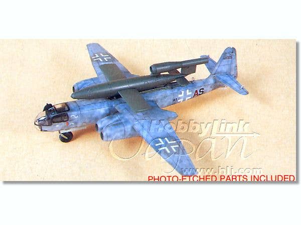 Reissue of the Dragon 1/72-scale Ar234C-4 kit with parts and decals to build it as a hypothetical V-1 carrying aircraft "A1+AS." Drop tanks, bombs and cameras are also included if you prefer to build a "normal" bomber or reconnaissance version of the world's first four-engine jet bomber. See box art for marking details.
