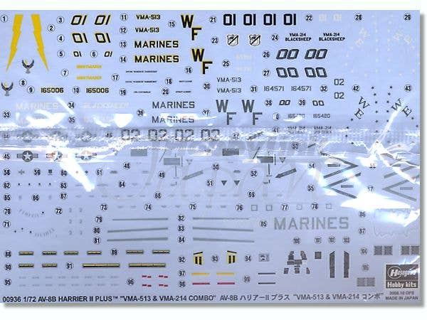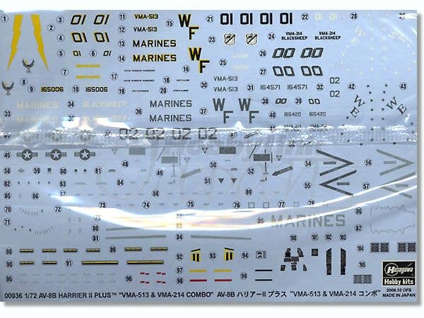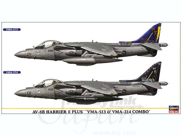 Limited reissue of two Hasegawa 1/72-scale AV-8B+ kits in one box with decals to mark them as any combination of four aircraft: WF/01 of VMA-513 in hi-vis markings; WF/00, also of VMA-513, in lo-vis markings; WE/01 of VMA-214 in hi-vis markings; and WE/02, also of VMA-214, in lo-vis markings. See box art for marking details.