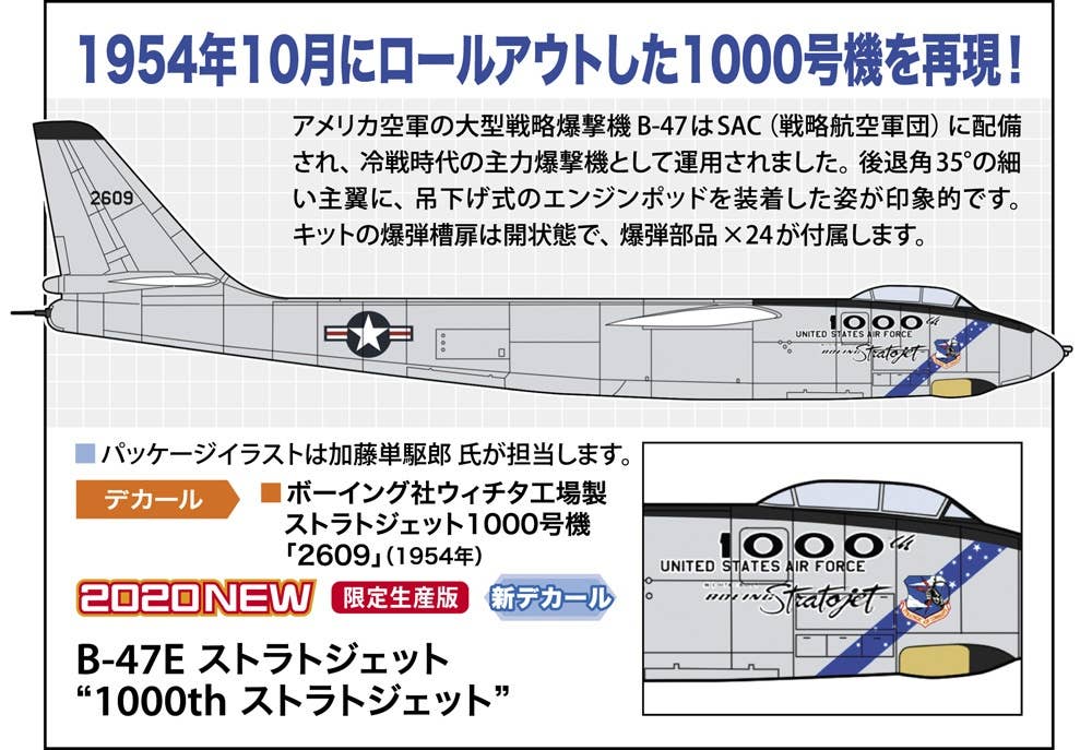 Now's your chance to remake the 1000th B-47 ever produced! Hasegawa brings us this incredible B-47E Stratojet 1/72 scale model. The bomb bay doors open and 24 bomb parts are included. Also includes decals. Fully completed this rather large kit comes to 471mm by 491mm.