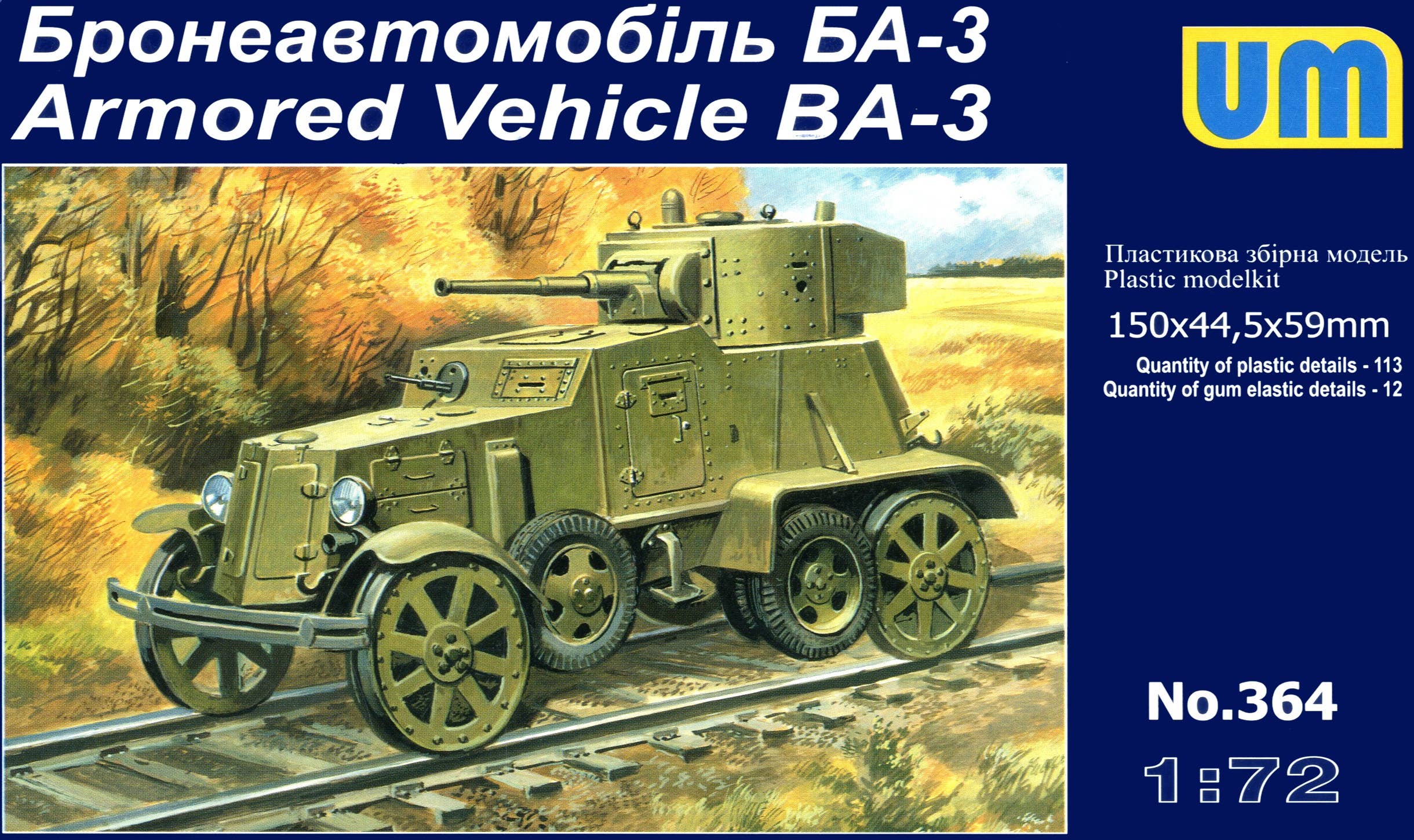 The manufacturing of the armored vehicle BA-3 was launched in 1934. The armored body was installed on the chassis of the GAZ-AAA autoobile. Its arms consisted of a 45mm gun and a 2x7 62mm machine gun. The armored vehicle has four crew members. In total, 168 machines were produced. The armored vehicle fought in Spain, Mongolia and Finland. In the beginning of the summer of 1935,the railway variant of the BA-3 armored car had been tested. For an increase in flotation ability on the rear slopes of the BA-3, the cross-country caterpillars known as "Overall" were applied.