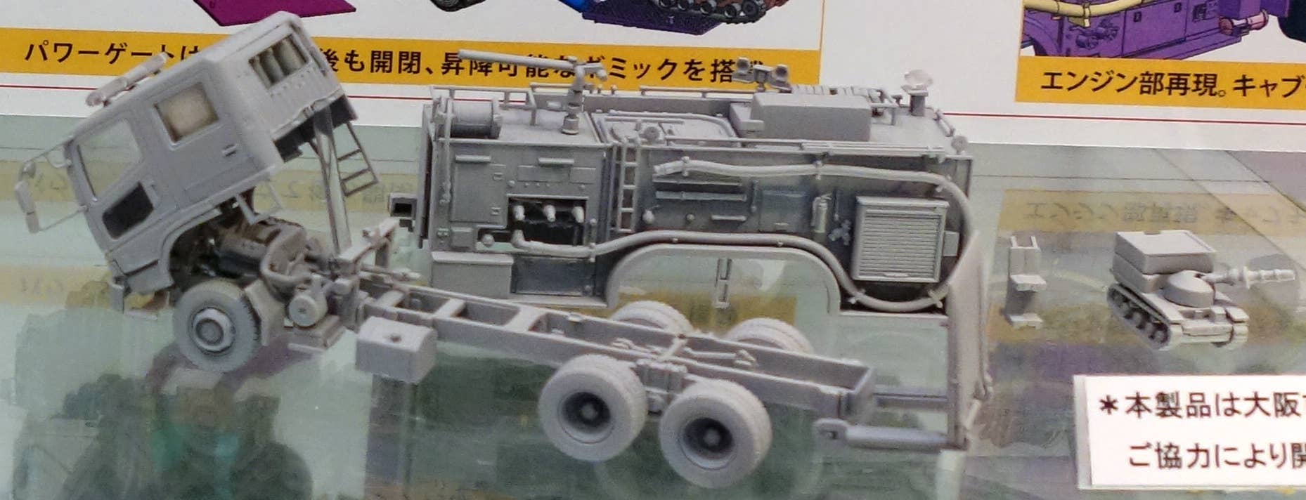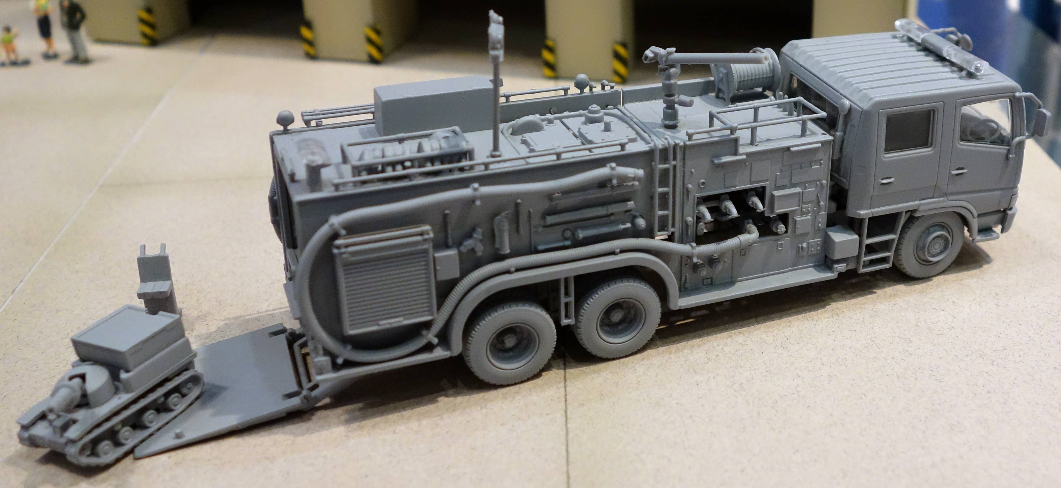 This model kit recereates the real vehicle in first class quality, and the enginge and chassis are fully detailed. The cabin can tilt, and the hatch on the rear deck works. The self propelled water cannon and its controller will be another extension of the joy of building this kit.