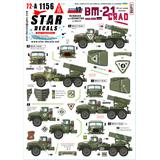 The set includes markings for BM-21-1 Grad 122mm rocket launchers based on Ural 375 or Ural 4320 trucks operated by the Russian military and the Donetsk People's Republic during the 2022-2023 invasion of Ukraine. It features five types of markings: four for the Russian military and one for the Donetsk military. The painting guide also includes template diagrams for creating additional armor modifications made locally.