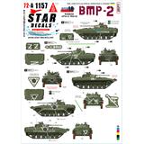 The set includes markings for BMP-2 infantry fighting vehicles operated by the Russian military during the 2022-2023 invasion of Ukraine. The set features five types of markings. The painting guide includes color diagrams depicting the characteristics of each vehicle, such as the presence or absence of fenders.