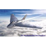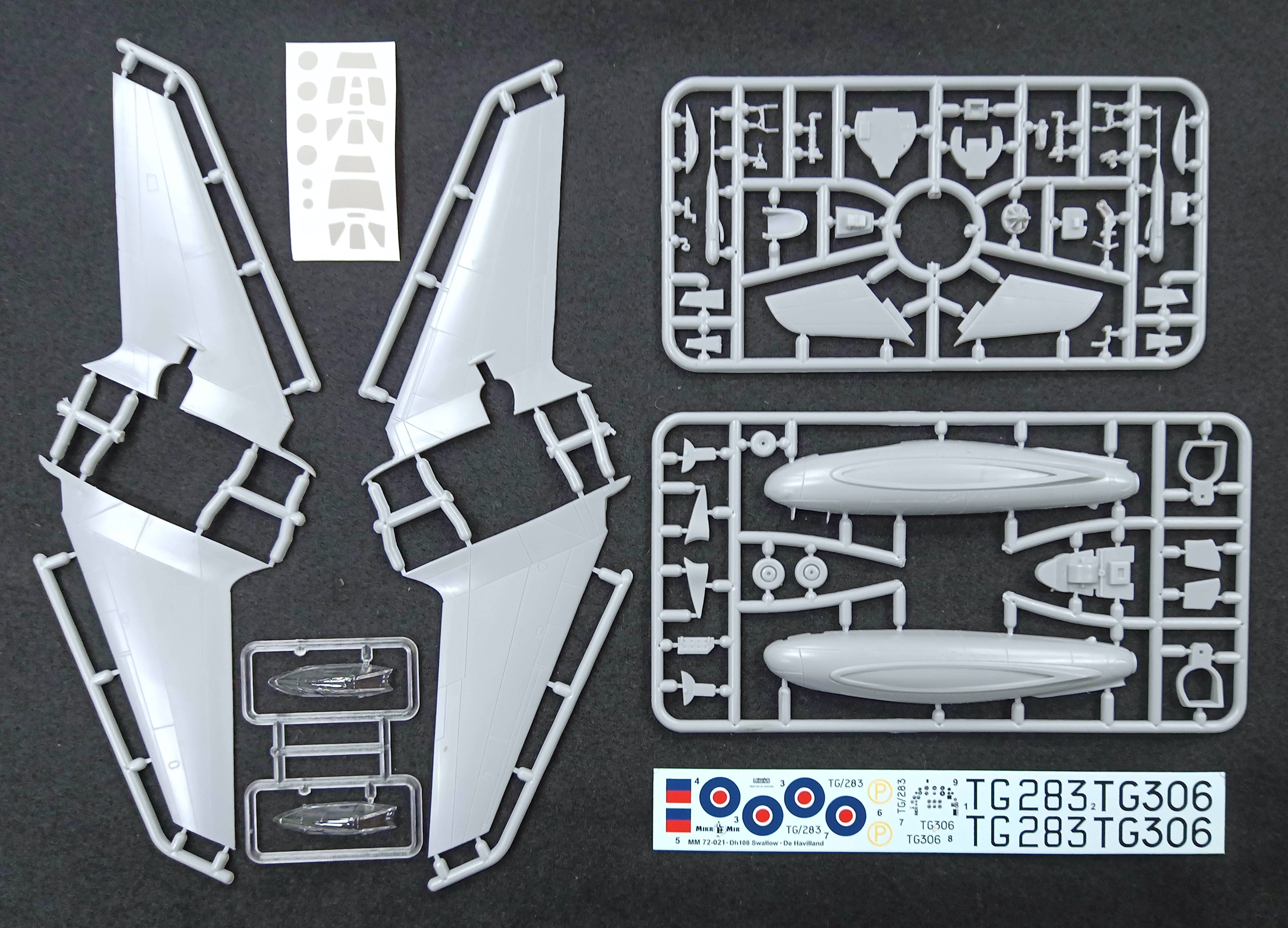 This kit from Mikro Mir is a completely new mold! The De Havilland DH108 Swallow is a tailless test aircraft with a swept wing and a vertical stabilizer, built in the United Kingdom on the De Havilland Vampire fuselage for high-speed flight and studies of swept-wing characteristics. It was equipped with the De Havilland Goblin centrifugal turbojet engine, and reached speeds past the speed of sound after overcoming accidents such as the deaths of multiple test pilots during test flights. The Unit 1 TG283, which was created to rest maneuverability at low speeds, and the Unit 2 TG306, which attached a spin parachute to the wingtip of Unit 1, made their maiden flights in 1946 and 1947 respectively. The third unit, known as VW120, which had its engine strengthened, made its maiden flight and broke the speed of sound in 1948. The DH108 continued test flights to study subsonic-to-transonic flight until 1950, but all three were lost in an accident.