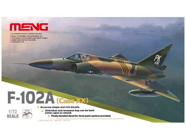 We re-release the 1/72 F-102A (Case XX) kit after the successful Case X kit. The kit consists of 100 parts on 6 plastic sprues and 1 clear sprue . It’s 289.4 mm in total length and 161.4 mm in width. Its unique belly weapon bay and weapons have been perfectly modeled. Three weapon bay positions and two types of falcon missiles are provided in the kit. Three paint options (USAF and ANG) are offered.You will enjoy building a Cold War era aircraft with this easy-build and detailed kit.