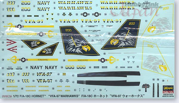 Limited reissue of the Hasegawa 1/72 scale F/A-18C kit with decals to mark it as either of two versions of the VFA-97 "Warhawks" CO's aircraft as assigned to MAG-12: BuNo 163444 "200" from 2006 as shown in the box art and 163769 "000" with similar but smaller tail markings from 2005. See box photo or art for marking details.