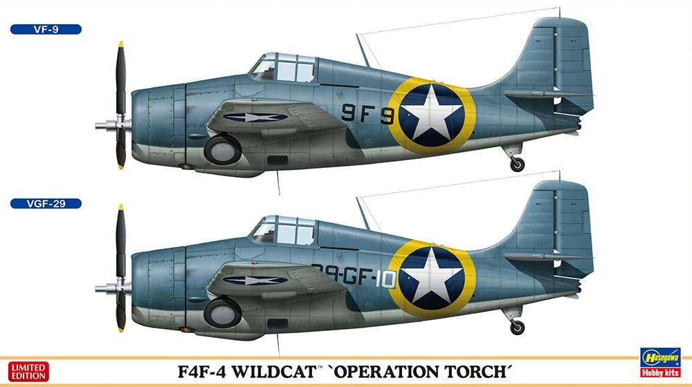 The Grumman F-4F Wildcat was the first aircraft the US Navy could bring to bear in large numbers in the early days of WWII. It was neither as fast, nor as maneuverable as its chief opponents. Nevertheless, its rugged construction and dependability, coupled with innovative tactics, made it a deadly threat to anything in the sky. US escort carriers brought the Wildcat to the shores of North Africa for Operation Torch. There, the guns of the type helped sweep the skies over the landing beaches. This limited edition kit combo features two aircraft and three sets of decals.