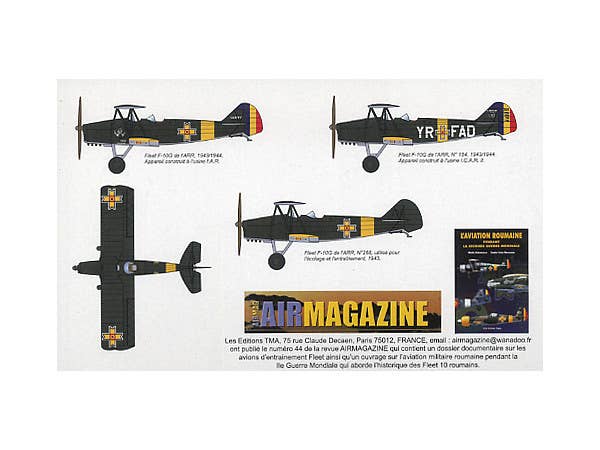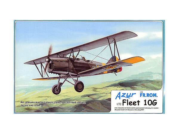 A nice little kit of the Fr. ROM. Fleet 10G in 1/72 scale from Azur. This aircraft was a Romanian-built version of the Fleet F-10G trainer/liaison aircraft. Includes vacuformed windscreens (2 copies). Decals are for three Romanian Air Force aircraft.