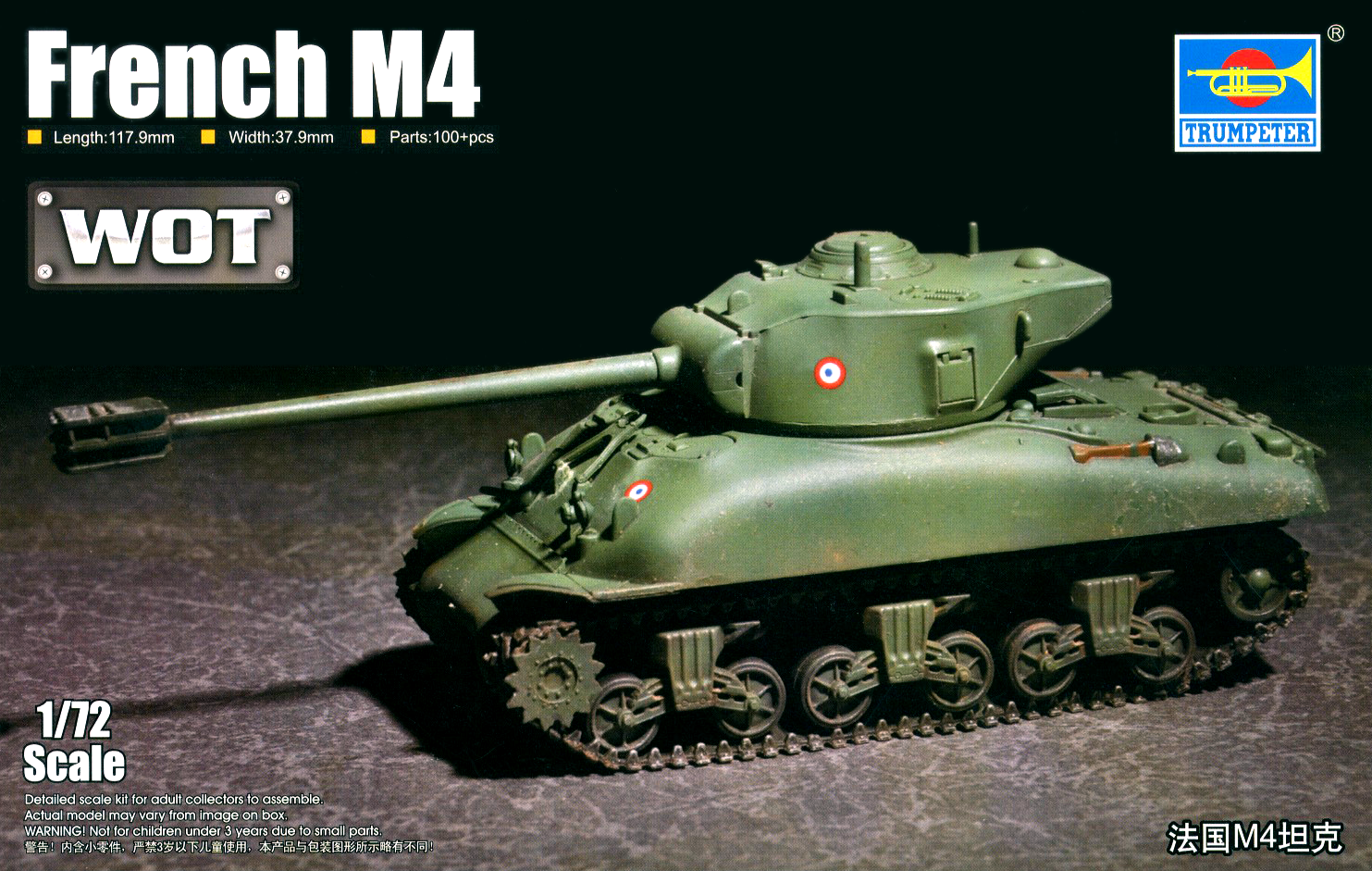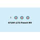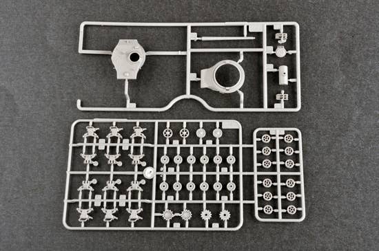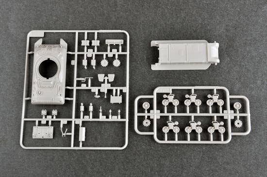 This scale kit is molded in grey plastic and includes decals and soft plastic tracks, Despite its small size, it includes over 100 parts. Measures 117.9mm long and 37.9mm wide upon completion.