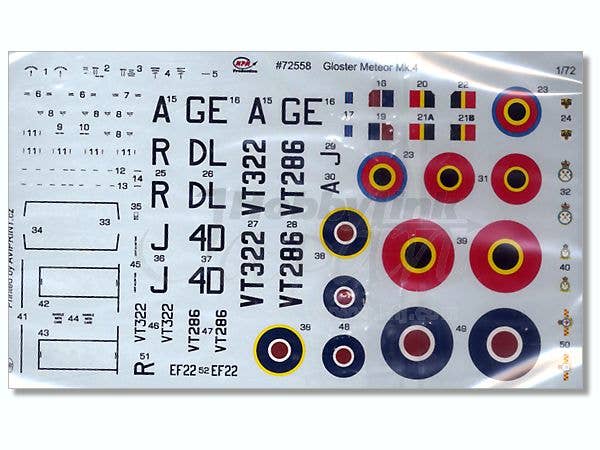 A very nice model of the Meteor Mk.4 in 1/72 scale by MPM. Includes detailed cockpit and landing gear as well as decals for two RAF and one Belgian aircraft.