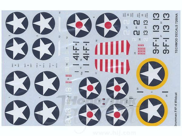 A set of high-quality decals for 1/72-scale Wildcat kits. Includes markings for Capt. Marian Carl's "2" and "13" of VMF-223 on Guadalcanal, "41-F-1" of VF-41 off the Ranger, "9-F-1" of VF-9 off the Ranger during Operation Torch, and "18" of VF-6 off the Enterprise.
