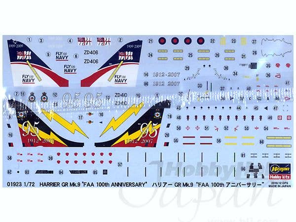 Limited reissue of the Hasegawa 1/72 Harrier kit with markings for either of two Harrier GR Mk.9: ZD406 in FAA 100th Anniversary markings and ZD410 in 4 Squadron 95th Anniversary markings. For marking details please see box image above.