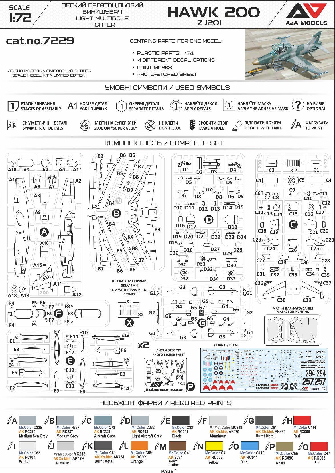 The Hawk 200 is a single-seat fighter-attack aircraft based on the Hawk 100 double-seat trainer. The nose of the Hawk 200 has been redesigned and equipped with a fixed cannon, and the same AN/APG-66H radar as is used in the F-16, redesigned. The kit can be built with a fixed aerial refueling probe, too. It made its first flight in 1986, was produced from 1990 to 2002, and is currently deployed in Indonesia, Malaysia and Oman.