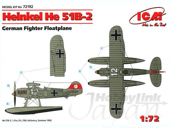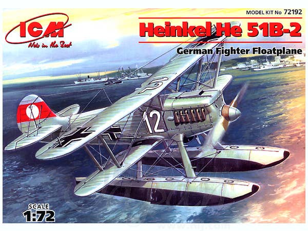 A very nice little (12.8cm long, 15.3cm in span) model of the He51B-2 floatplane fighter in 1/72 scale from ICM. Also includes the wheeled landing gear for a landplane. For marking details please see box image above.