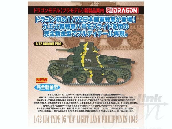 Dragon's first kit of WWII Japanese armor in 1/72 scale! This all-new tooling is sure to please fans of Japanese armor and 1/72-scale armor modelers alike. Tracks are provided as flexible one-piece belts. This is a small tank in 1/1 scale, and very tiny in 1/72! But Dragon has packed it with detail, as you can see from the photos here...that's not 1/35 scale! That's fantastic detail in 1/72!