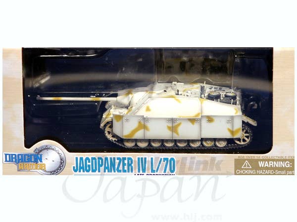 "Dragon Armor" is a series of 1/72 scale pre-built AFV models made of die-cast metal and plastic. Each highly-detailed model is beautifully painted, marked and weathered. These are authentic scale models, quite different from the inaccurate die-cast toys other die-cast car model manufacturers offer. Each model comes packed in a transparent plastic case. This model depicts a late production Jagdpanzer IV L/70 tank destroyer with schurzen side skirt armor, finished in a winter camo scheme.