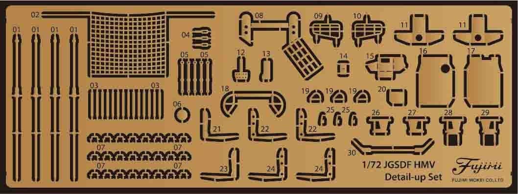 This is a set of photo-etched metal detail parts as shown here for a JGSDF High Mobility Vehicle by Fujimi.