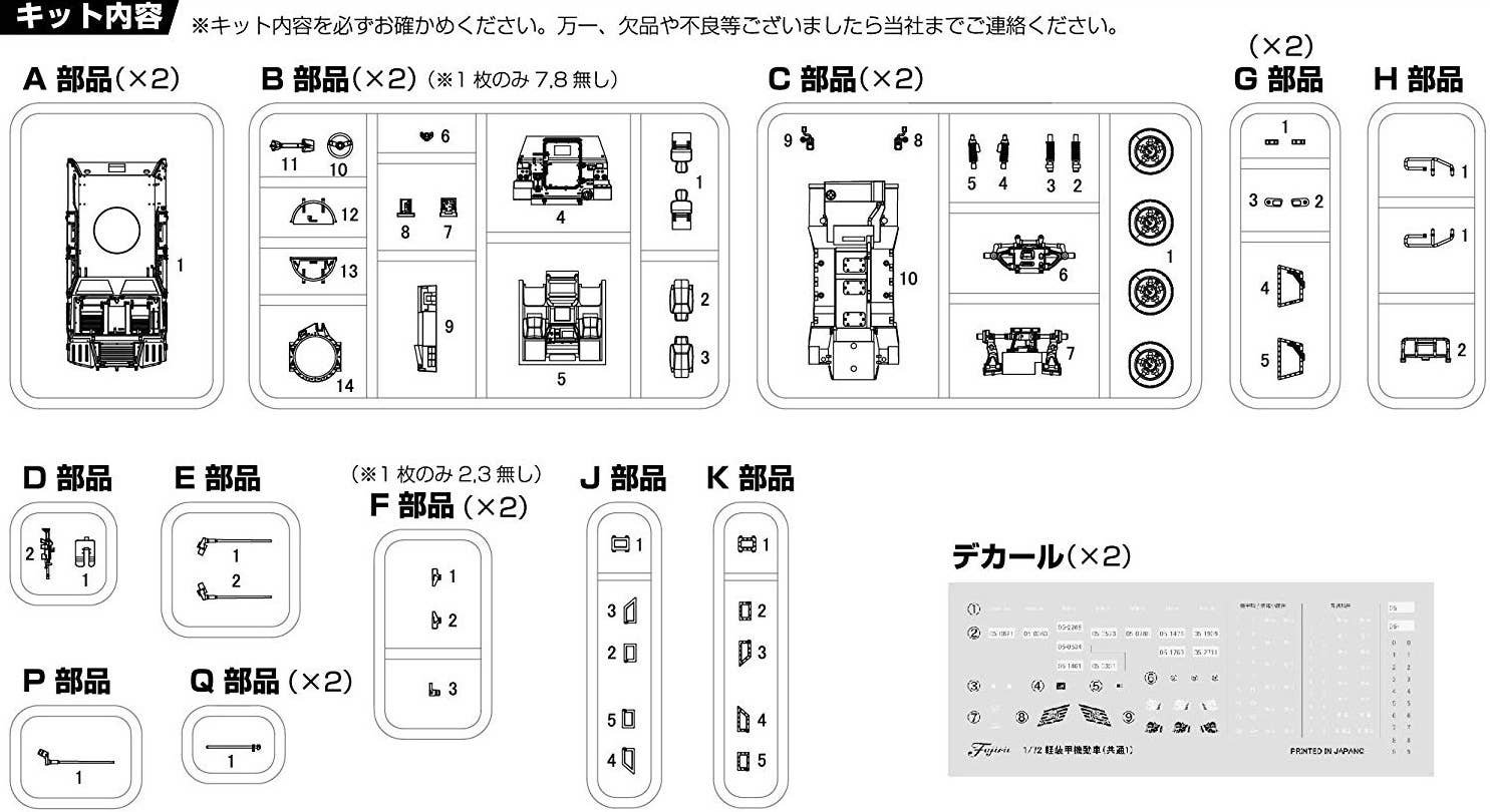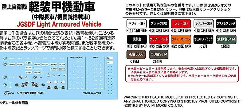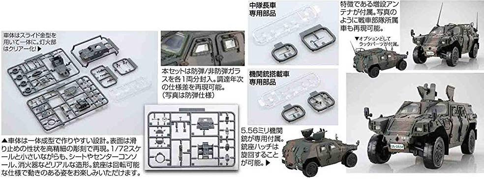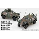 From Fujimi comes a 1/72 scale kit of the JGSDF Light Armoured Vehicle. The parts are newly modeled based on research of the vehicle, and the kit includes parts to build two models: a commander vehicle with rack, and a vehicle equipped with a 5.56 MINIMI machine gun. When completed, they'll measure about 62mm long and 31mm wide.
