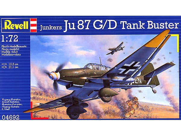 Limited reissue of the Revell 1/72 scale Ju87D/G kit with parts and decals to build it as either a dive-bomber D model or the pictured tank-buster G model. Includes engine visible under a removable cowling. See box photo or art for marking details.