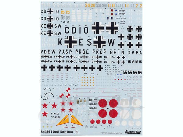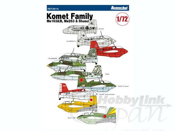 A set of high-quality decals for 1/72 scale Axis rocket interceptor kits. Includes markings for the Me163A, Me163B-1 of ELK 16, Me163B of JG400, Me263, Me163S in post-war Soveit markings, Me163B in post-war "Avions Lestrade" markings, MXY8 Shusui in IJNAF prototype markings and again in hypothetical "1946" markings.