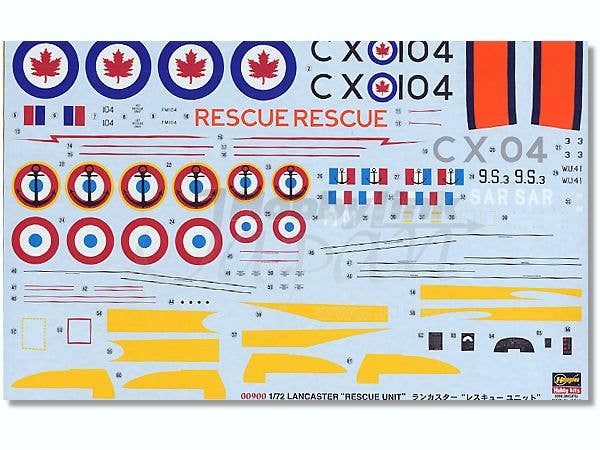 Limited reissue of the Hasegawa 1/72-scale Lancaster kit with decals and new radar and antenna resin parts to build it as any of three non-bomber models: Mk.10MR CX104 of No.107 Rescue Unit, Royal Canadian Air Force; MR.1 "9.S.3" of French Navy Escadrille 9.S from 1961; and MR.7 "M 102" of the French Civil Aviation Administration from 1957. See box art for marking details.