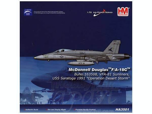 A pre-painted and mostly pre-assembled 1/72 scale diecast desktop model of the F/A-18C. Includes parts for extended and retracted landing gear options, open and closed canopy options, separate seed brake and an in-flight display stand. Painted in the markings of "AA/401" of VFA-81 "Sunliners" aboard the Saratoga during Desert Storm.