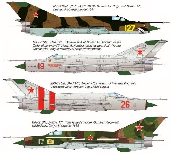 The MiG-21SM is the most produced type in the series, with Subfil 22 radar, GSh-23L interlocking guns and a Tsumanski R13-300 engine. This kit includes decals for four different Soviet Air Force aircraft.