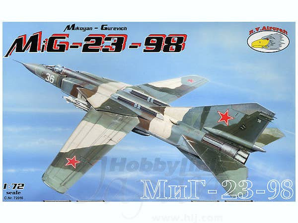 A very highly-detailed model of the MiG-23-98 from R.V. Aircraft of the Czech Republic. The main parts are in injection plastic, with photoetched parts for antennas and other fine details. Includes decals for Russian aircra "36" .