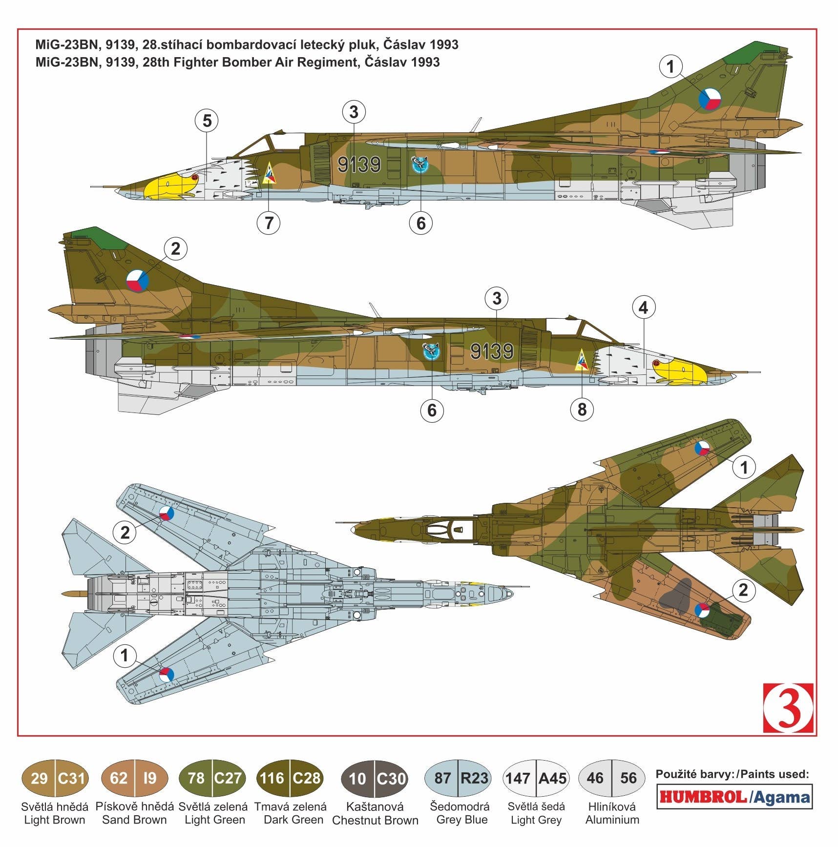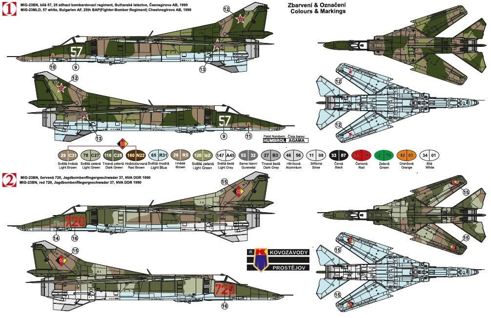 New-mold kit! The MiG-23BN is an export type of the MiG-23BM aircraft produced for Russia; it was produced from 1973 to 1985. Abolishing the fighter-type radar greatly changed the shape of the nose, and it was loaded with ground-attack equipment such as the Sorcol 23S aiming sytem phone and laser ranging ruler. Includes decals for aircraft flown by Bulgaria, East Germany and Czech.
