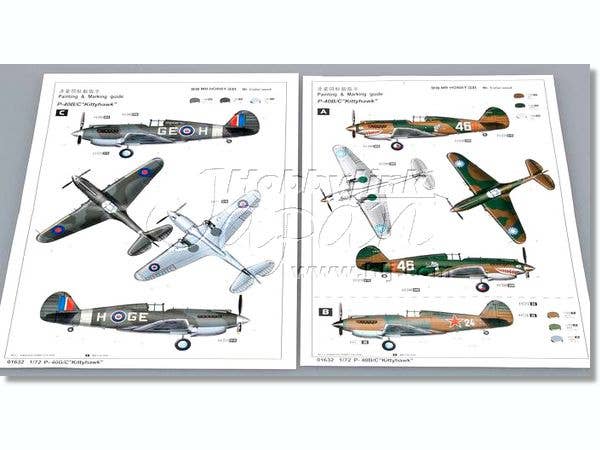 A very nice new-tool 1/72-scale P-40B/C from Trumpeter completes their early Warhawk series across the three major modeling scales--perhaps they'll try 1/24th next? The level of detail is quite good, with molded-in cockpit sidewall detail, seat with separate frame, separate exhausts, and deep wheel wells. Decals are for the RAF Kittyhawk GE H, "46" of the AVG Flying Tigers, and "24" of the Soviet Air Force.