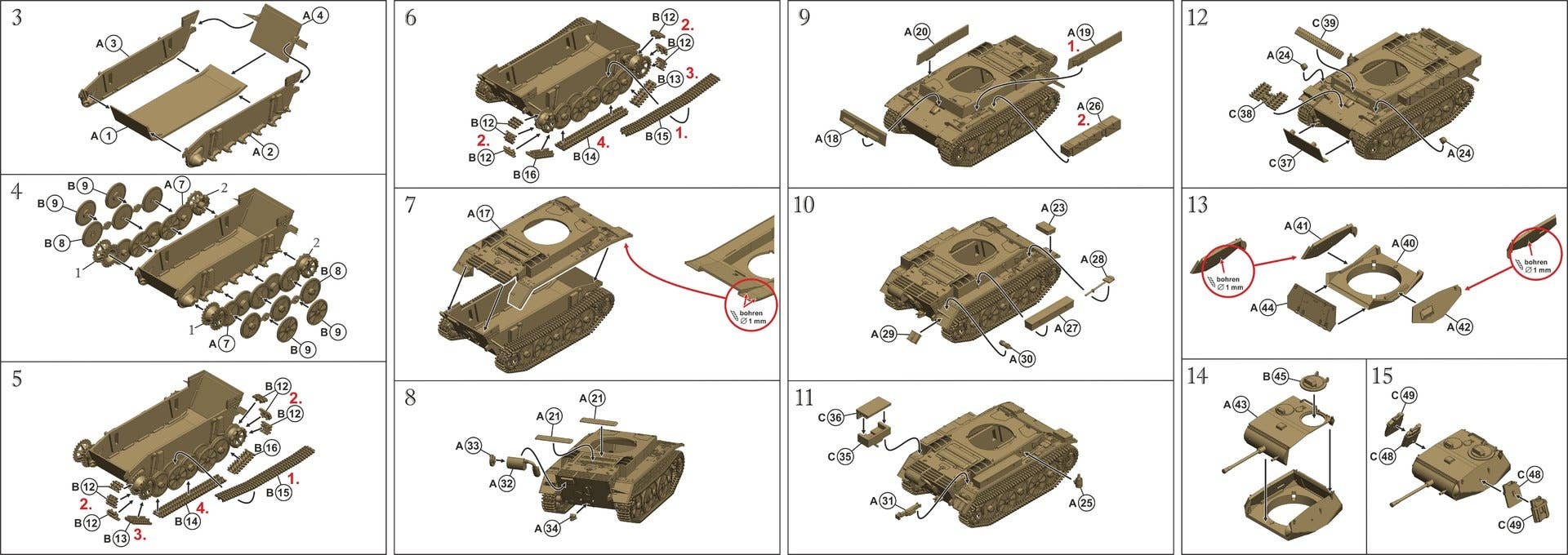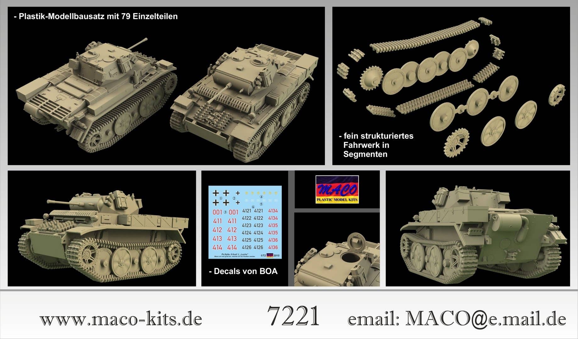 This kit will be about 6.5cm long when completed; consists of 79 pieces, and comes with decals. The tracks feature finely structured segments.
