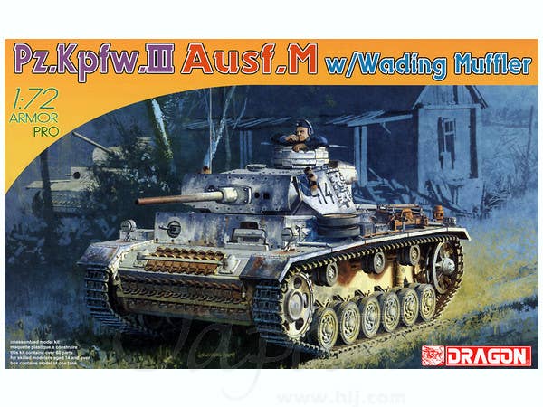 Dragon's highly-detailed kit of the Panzer III Ausf. M. Includes photo-etched metal detail parts and flexible belt type Dragon Styrene tracks. The smoke grenade launchers and hatches on the turret side have been faithfully recreated, along with the accurately represented jack, cooling air intakes, and toolbox with padlock.