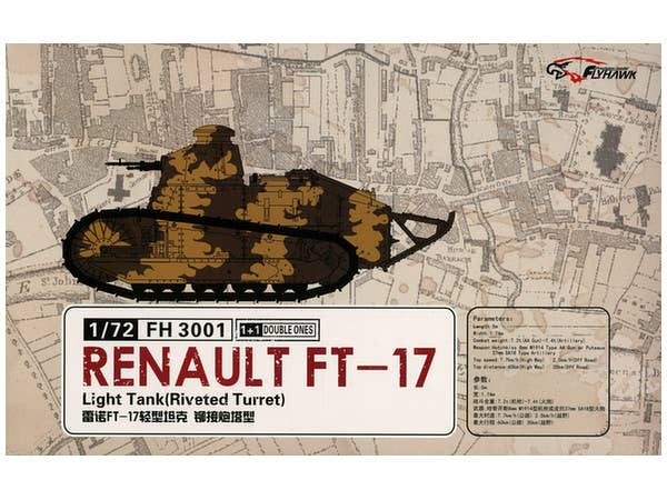 This well-detailed kit of the Renault FT-17 light tank with riveted turret, used during late WWI and beyond, is molded in gray plastic, features decals and photo-etch parts, contains illustrated instructions in English and Japanese, and comes with a color painting guide.