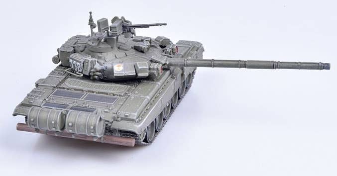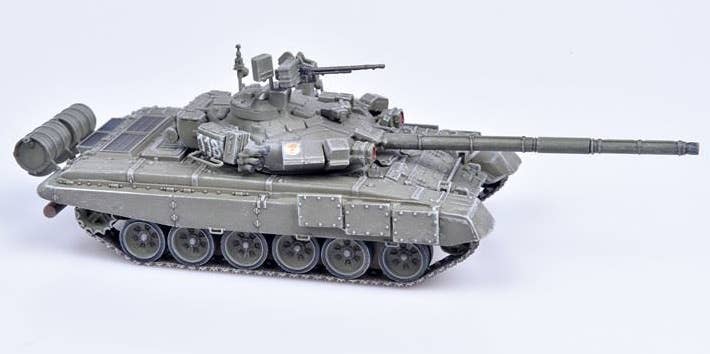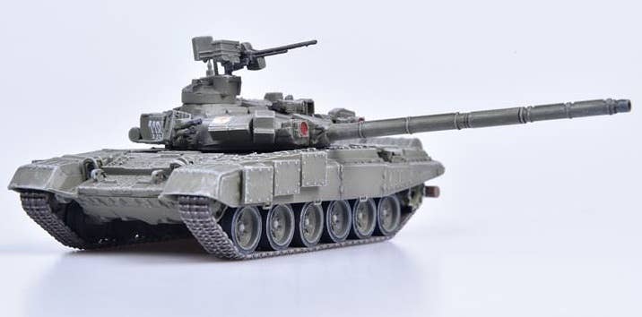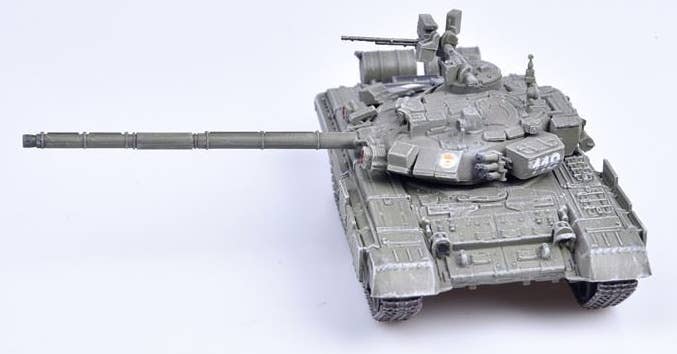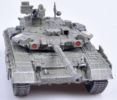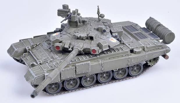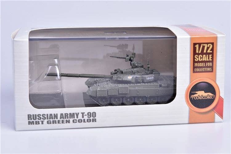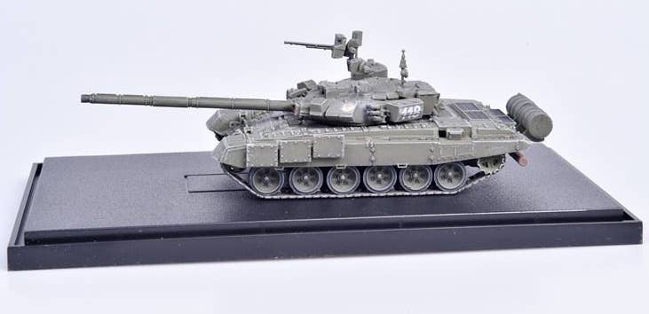 This is a fully assembled and beautifully finished model of the Russian Army T-90 MBT in green, mounted on a black plastic base with a clear plastic cover to keep it free of dust and fingerprints.