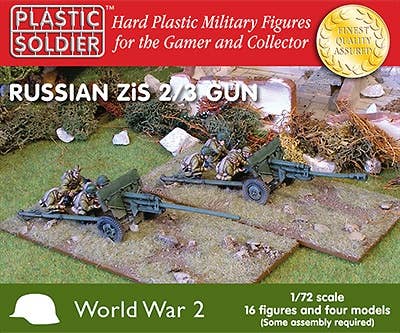 Includes 4 guns and crews. Each gun sprue contains options to build either the 57mm anti-tank gun M1943 (ZiS 2) or 76mm divisional gun M1942 (ZiS 3). Molded in gray styrene.