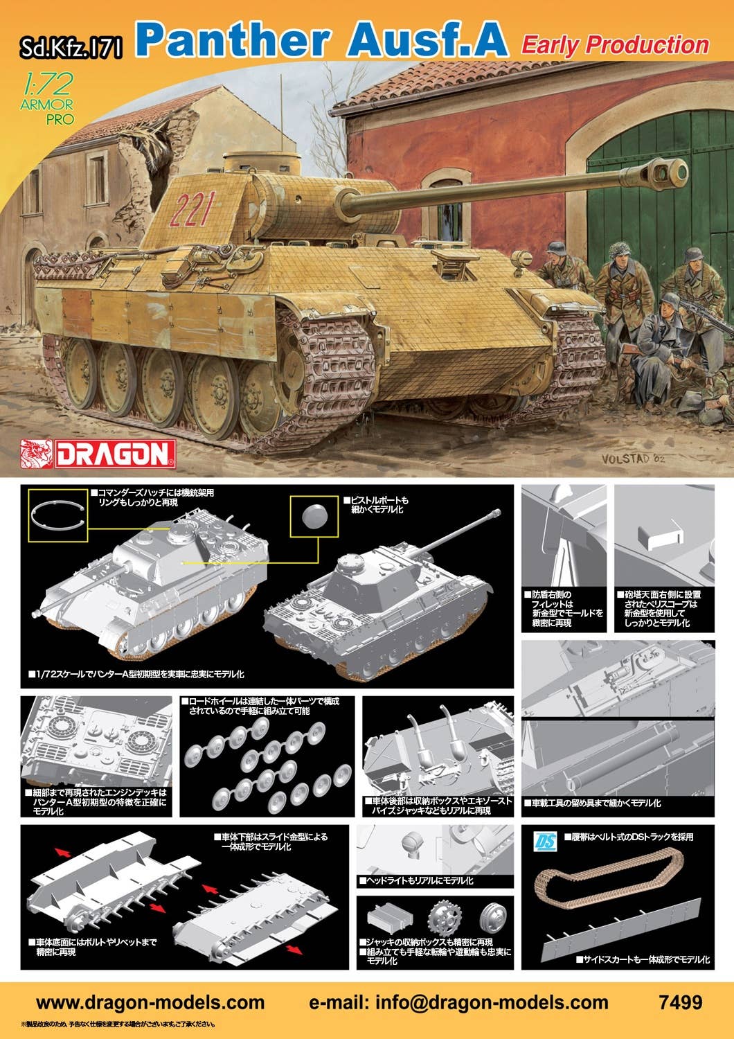 Dragon has previously produced 1/72 scale kits of early and late variants of the preceding Panther Ausf.D, and new to the range is this Panther Ausf.A Early-Production tank. Chronologically it follows on from the previous releases, giving modelers a new Panther variant to build. The turret is correctly suited to an Early-Production vehicle, possessing a periscope on the right side of the turret roof, plus a requisite fillet molded onto the side of the mantlet base. The upper hull is made as a single piece thanks to the clever use of slide molds. The lower hull tub has been formed the same way, thus ensuring a stable foundation for the rest of the build. All the appropriate characteristics of this Ausf.A Early-Production variant are present, and convenient DS tracks are provided too. Dragon’s delightful 1/72 scale Panther A definitely receives an ‘A’ grade!