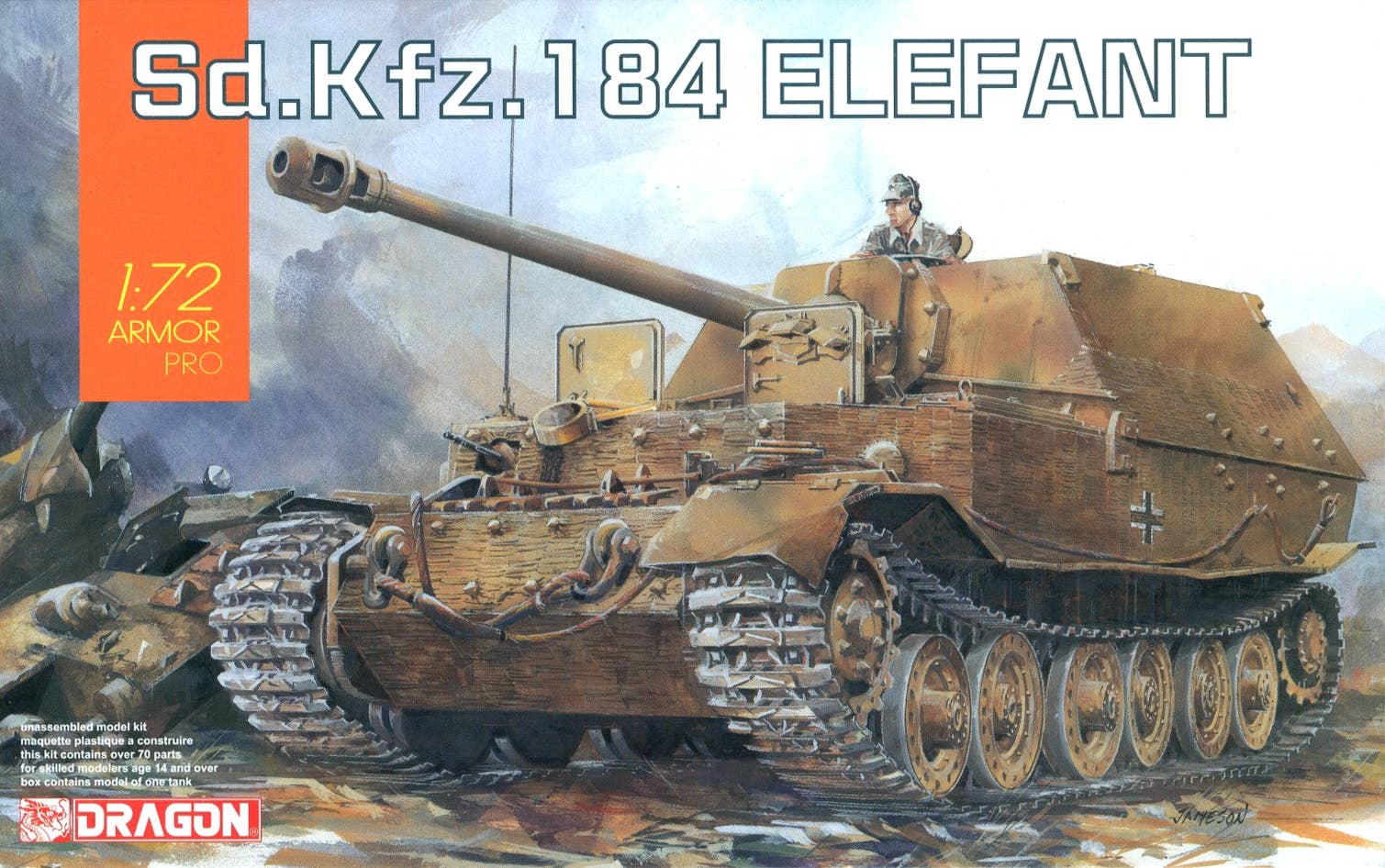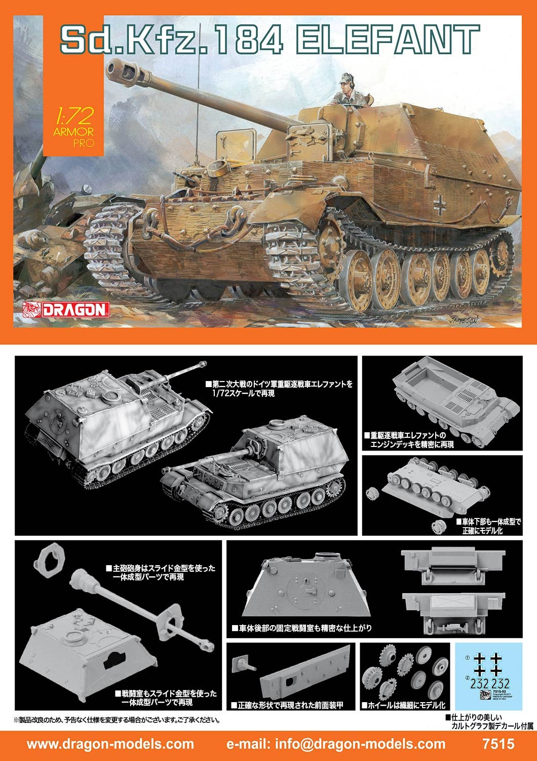 Dragon brings us a new kit to reproduce the German army heavy destroyer Elefant tank in 1/72 scale! Dragon have taken extreme care with all details on this kit - the characteristic style of the long cannon barrel has been faithfully reproduced, and the suspension unit firmly expresses the unique form of the Porsche-manufactured chassis. Even down to smaller details, Dragon have also taken care to delicately repoduce the wheels, and parts of the upper body, such as hatches, and slits between engine deck parts. The main gun barrel has been reproduced with a single molded part using a slide mold. Even in small 1/72 scale, this is a kit with prescence!